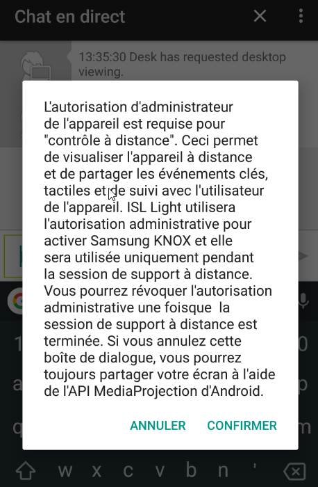 Note : Sur certains téléphones, l'autorisation d'administrateur n'est pas demandée, il n'y a donc qu'un affichage de l'écran et on ne peut contrôler le téléphone à distance et seulement "pointer" via un curseur.